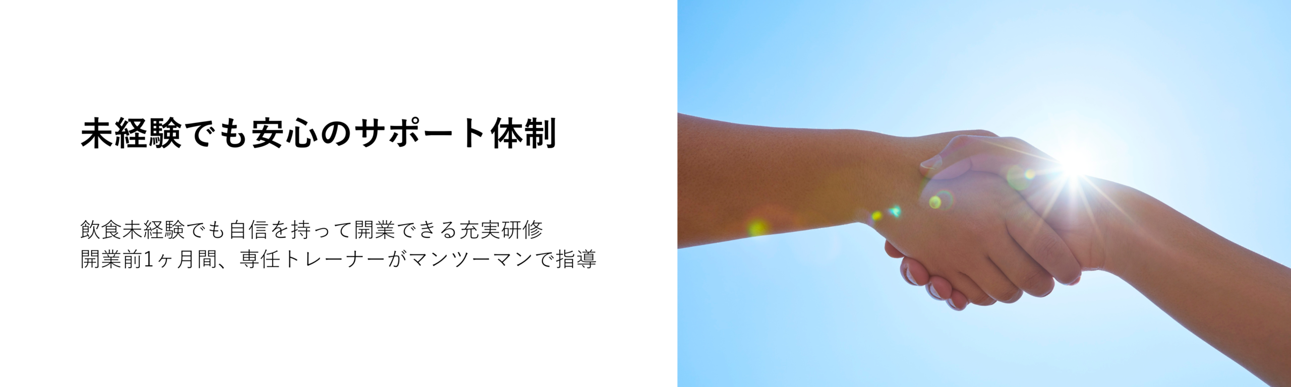開業前に1ヶ月間の実地研修を実施し、オペレーション・製造・接客・衛生管理・発注管理まで、専任トレーナーがマンツーマンで指導します。 - 初期費用はどれくらいかかりますか?