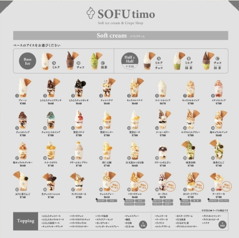 ソフトクリーム・クレープを中心に30種類以上のメニューがあります。